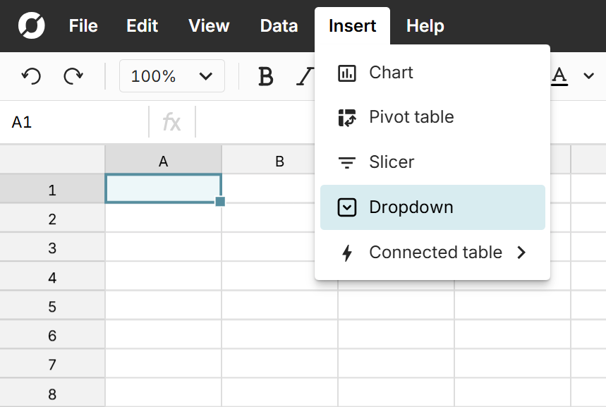 Dropdowns are a type of data validation. In addition to selecting Dropdown as a condition when creating a data validation rule, you can also insert a dropdown by going to Insert, Dropdown in the header menu.
