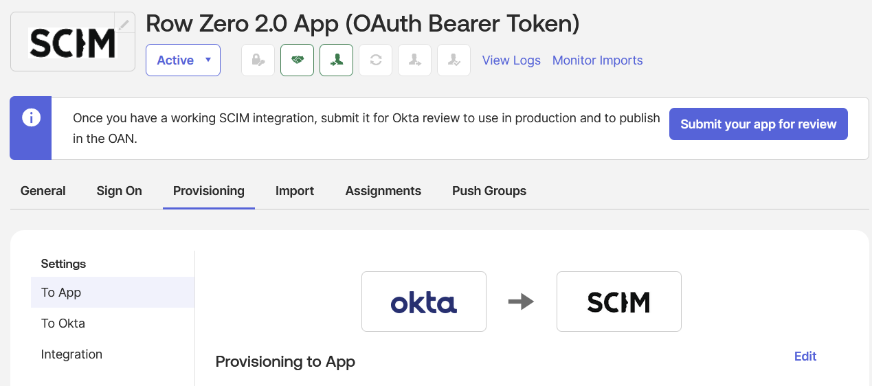 This guide describes how to sync users and groups to Row Zero with Okta using SCIM (System for Cross-domain Identity Management). Once set up, any users or groups assigned to the application in Okta will automatically sync to Row Zero.