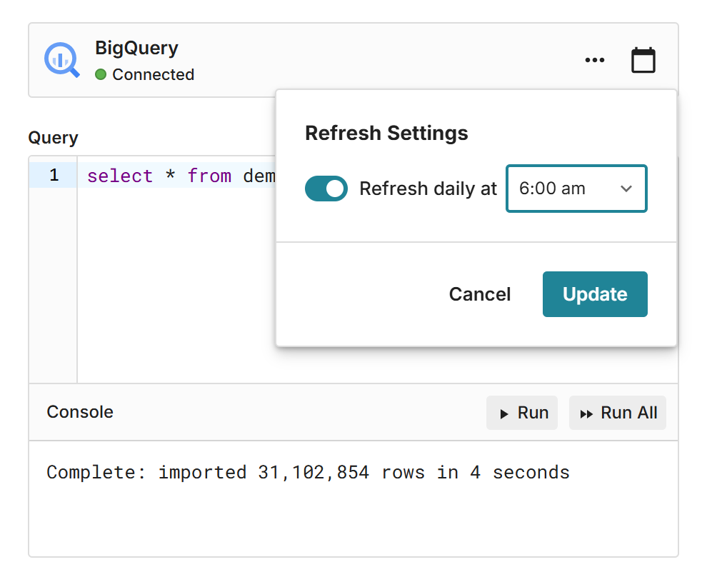 The BigQuery connector is available for Enterprise customers. If you're already a customer, please contact us to set up BigQuery OAuth. If you're not yet a customer, schedule a demo to learn more.