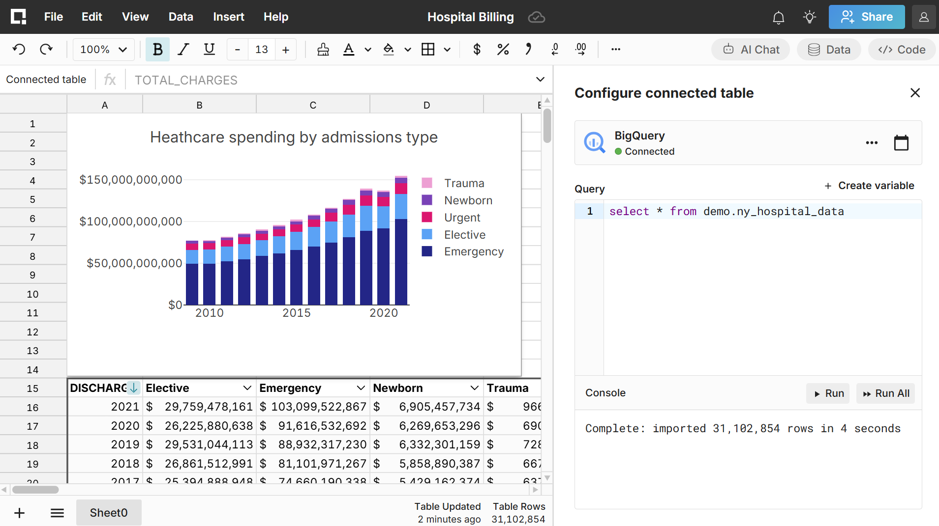 Row Zero is a powerful alternative to Google Connected Sheets for BigQuery. Row Zero works like Google Sheets but supports much larger data and has a built-in BigQuery connector to easily build connected spreadsheets that auto-update.